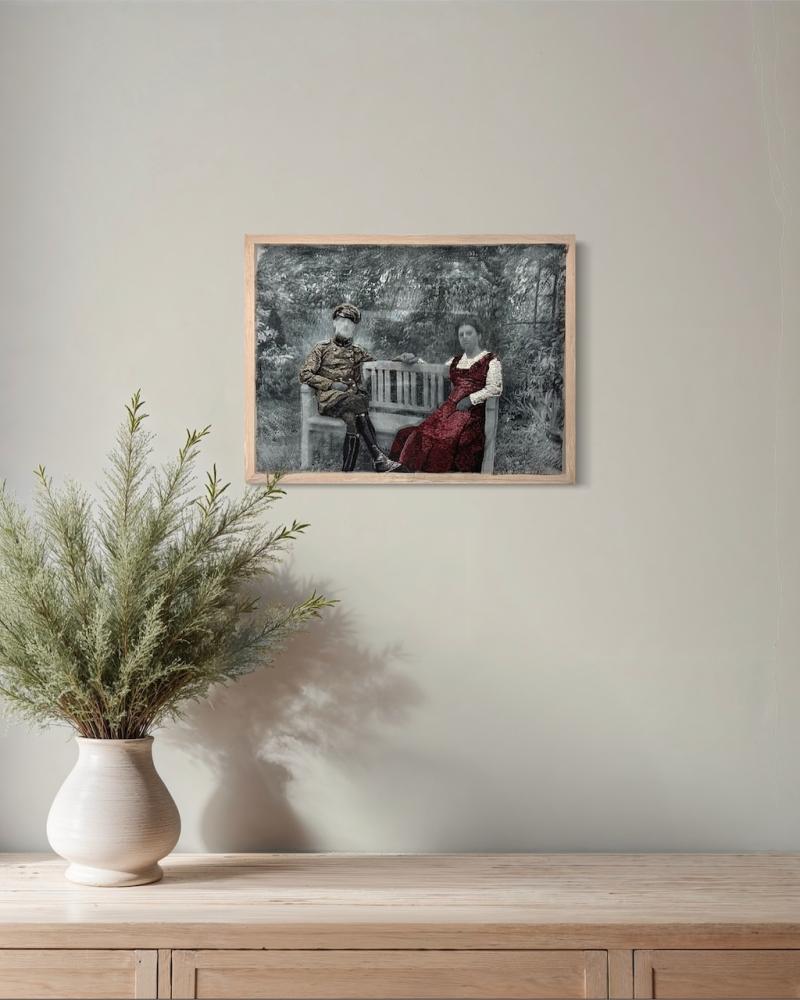 Old photographs printed onto translucent fabric, and embroidered on the areas corresponding to clothing.