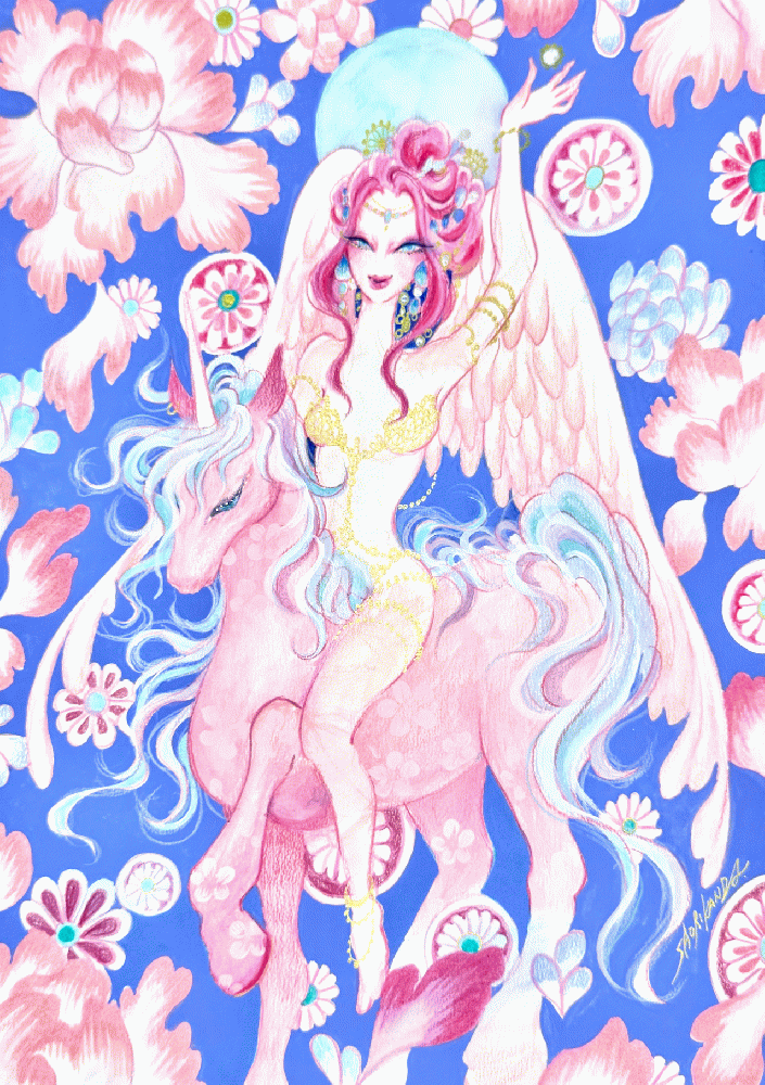 水彩イラストボードに アクリル絵の具、水彩色鉛筆、 ピグメントマーカーで描画