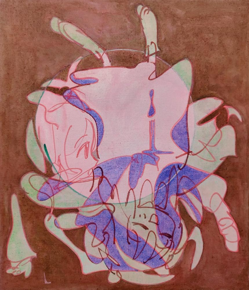 私の場合、表現は、リアリティを感じられる二次元から始めるしかない。私は普段pcやノートに、SNSにあげるために生みだしたような物語のないキャラクターを落書きするが、キャラクターは自分自身では自立できないほど弱々しく、私に少し似ているようにも思う。私は線体であるその子を絵画の中で、ただの線に還るように解きほぐし解放することを試みる。雑多な要素をほぐし、真に本質的なものを探るなかで、現実のリアリティを少しでも感じたいと思っている。