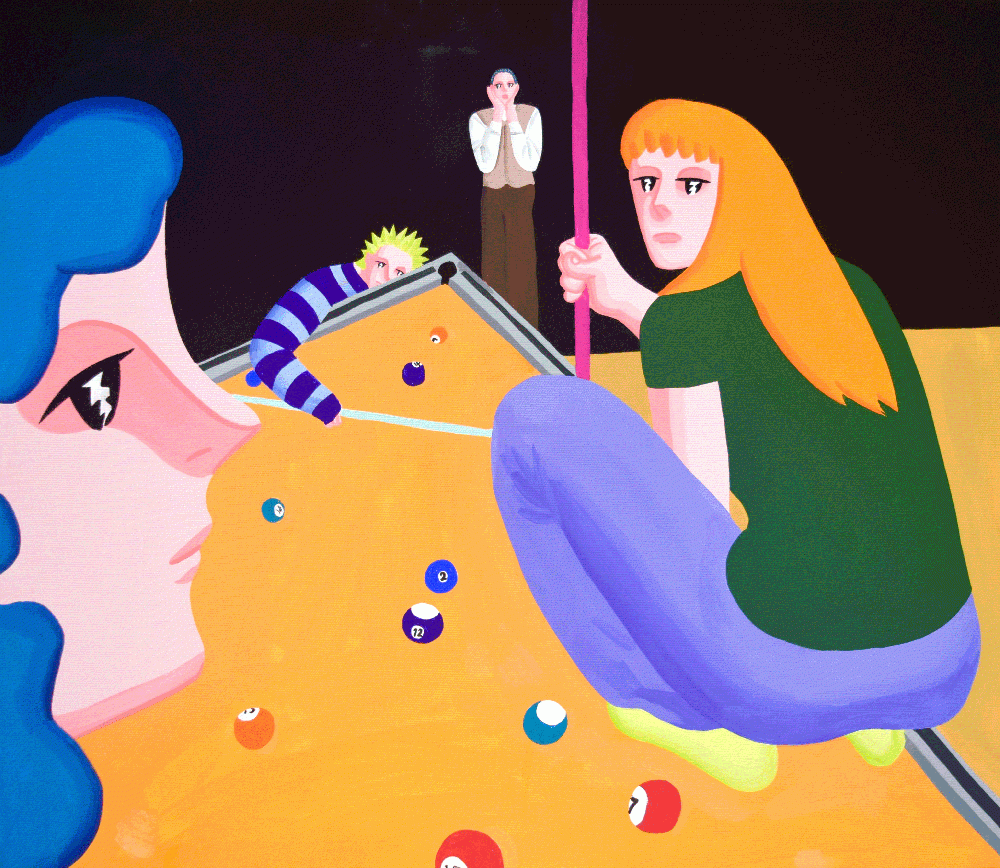 Born in 2001 in Hyogo, Japan. Currently based in Tokyo. With a playful, offbeat perspective on the world, she depicts slightly skewed realities through a humorous and deadpan touch. Influenced by the Showa-era manga once owned by her mother and aunt, her works explore scenes where human foolishness and coldness coexist, aiming to subtly jolt the viewer’s mind. Using mainly acrylic gouache and markers, she creates freely with vivid colors across various materials such as canvas, illustration board, and fabric. In recent years, she has expanded her practice through participation in art fairs such as Art Fair Beppu and by creating wall art for the Pentel × Mural Rookies Project. Guided by a spirit of playful freedom beyond rules or conventions, she continues to pursue her artistic expression with energy and curiosity.