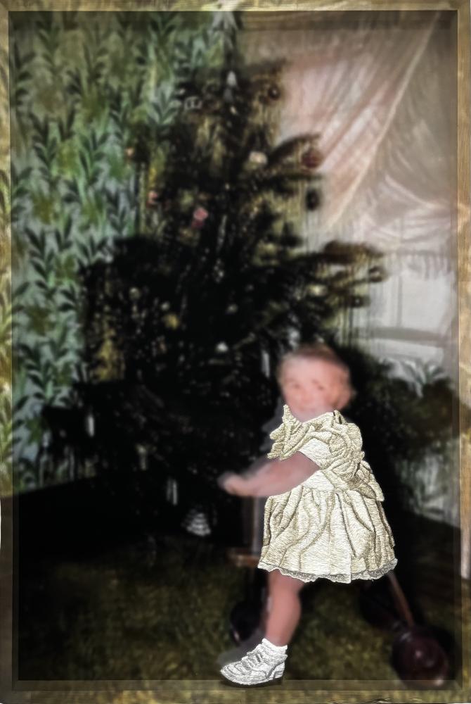 古い写真をAIでカラー加工したものを、薄く透ける布に印刷し、衣服の部分に刺繍を施している。