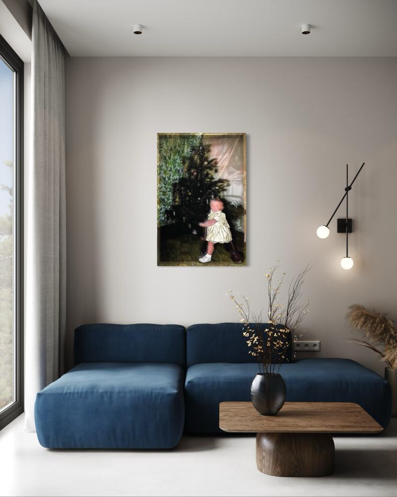 Old photographs are colorized using AI, printed onto translucent fabric, and embroidered on the areas corresponding to clothing.