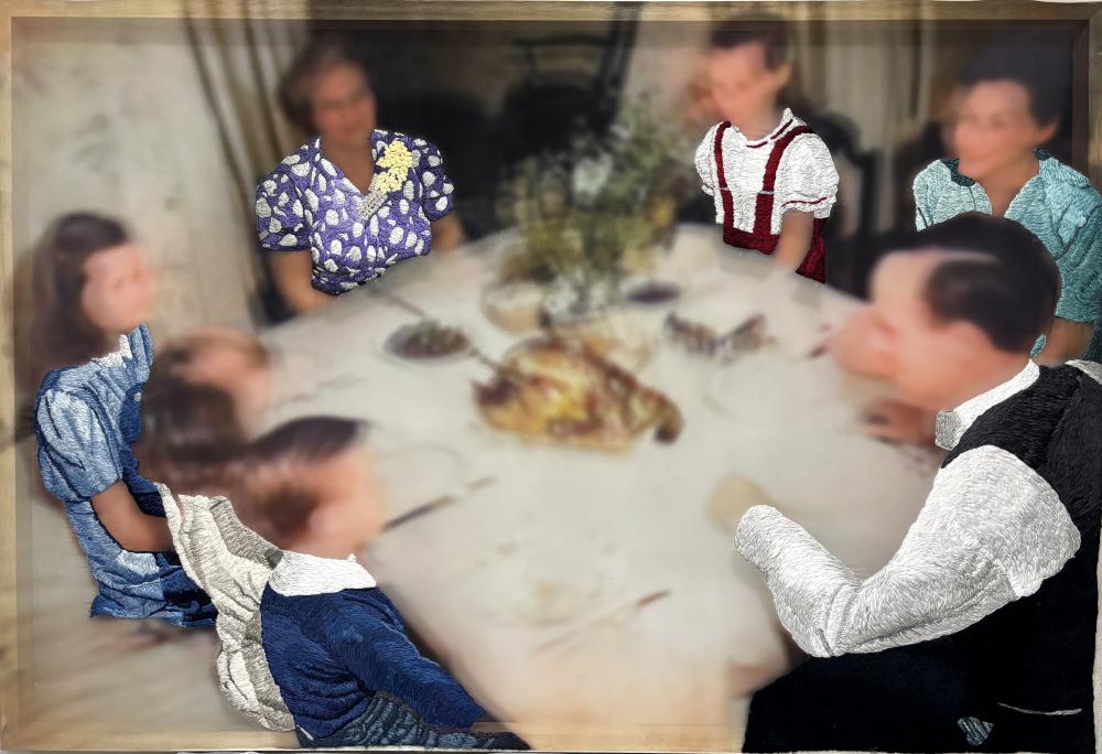 古い写真をAIでカラー加工したものを、薄く透ける布に印刷し、衣服の部分に刺繍を施している。