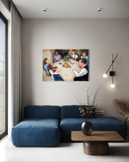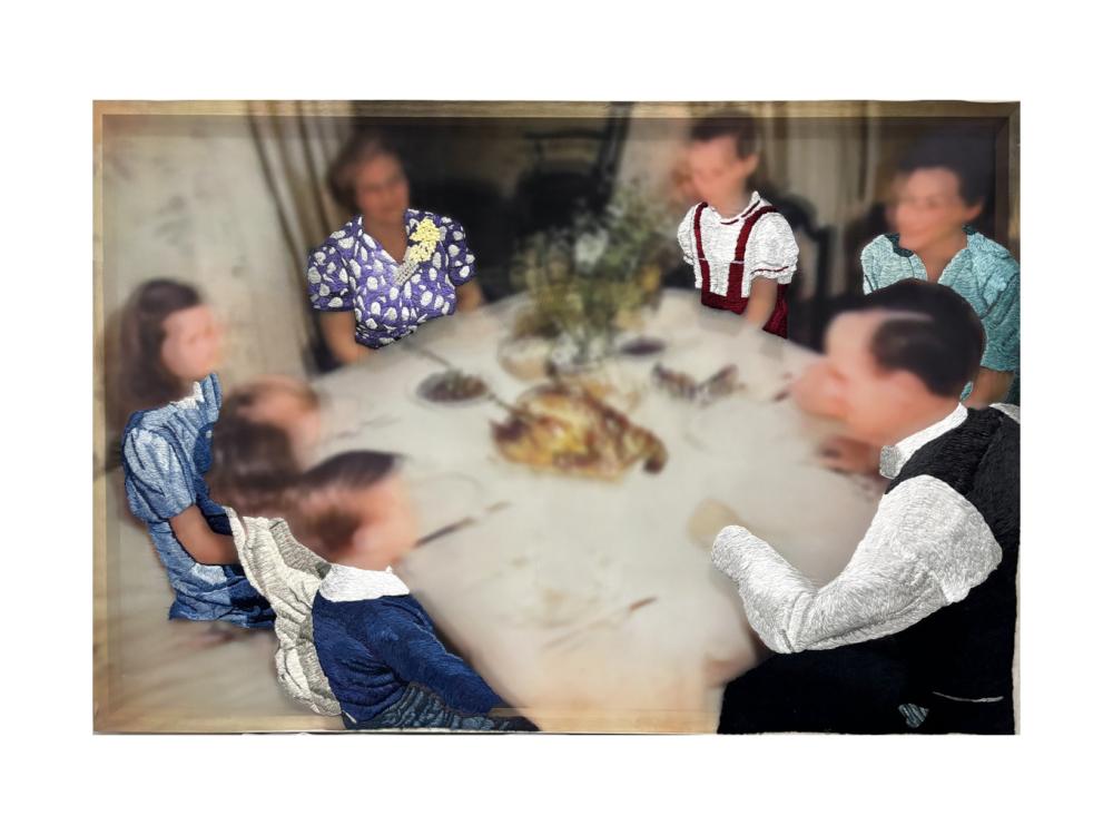 Old photographs are colorized using AI, printed onto translucent fabric, and embroidered on the areas corresponding to clothing.