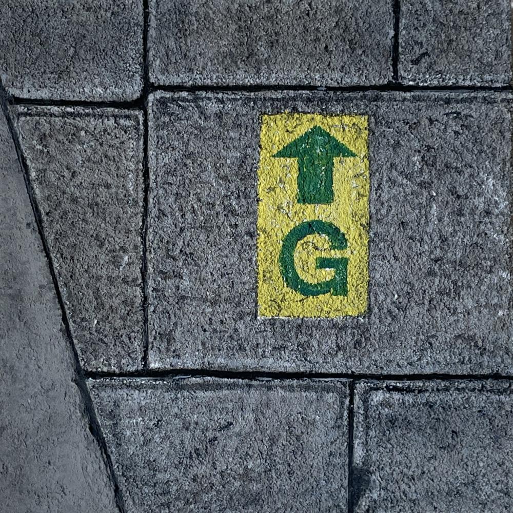 ”The hint is right nearby” Perhaps what we need to live well is already in front of us. A painting of an arrow marking for a gas line, quietly embedded in the asphalt of a road.
