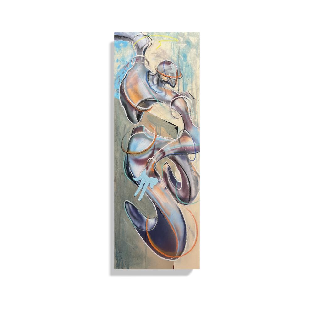 After that, I add subtle complementary colors and lines using acrylic paint, and finally, with oil pastels, I bring forward the lines that form the core axis of the initial image.
