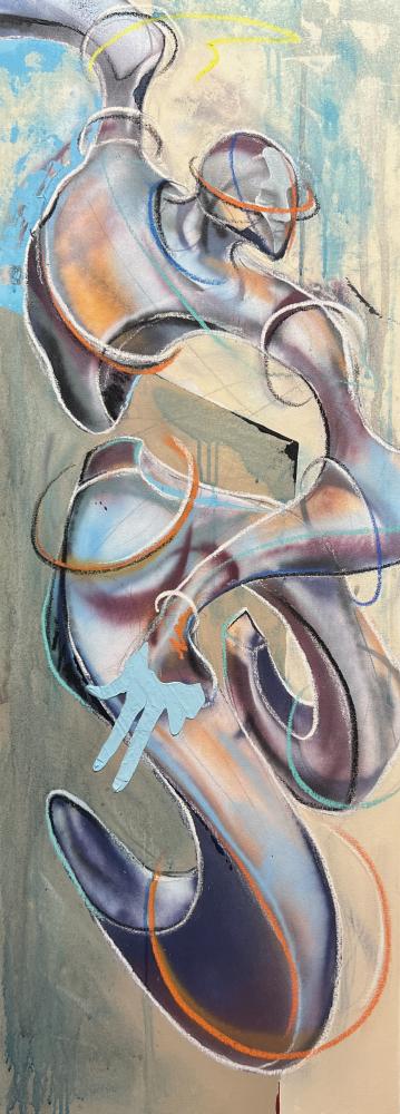 In the “Initial Impulse” series, I create works based on the idea that an “initial impulse” emerges within the underdrawings and sketch lines that appear when depicting the human figure. The lines captured impulsively with spray are ultimately traced using oil pastels.