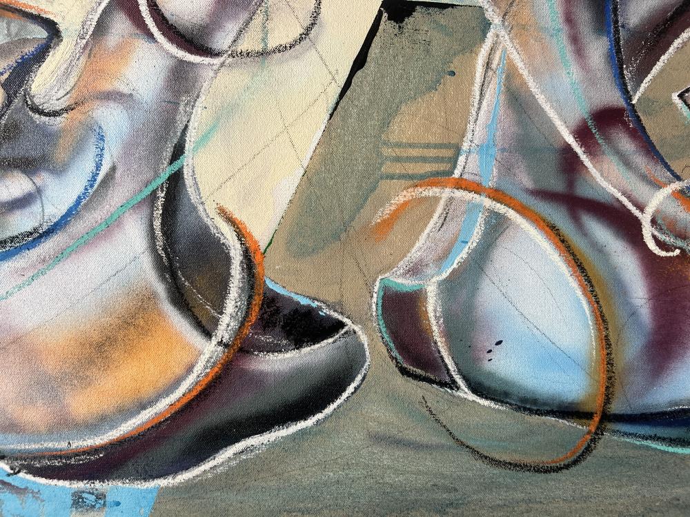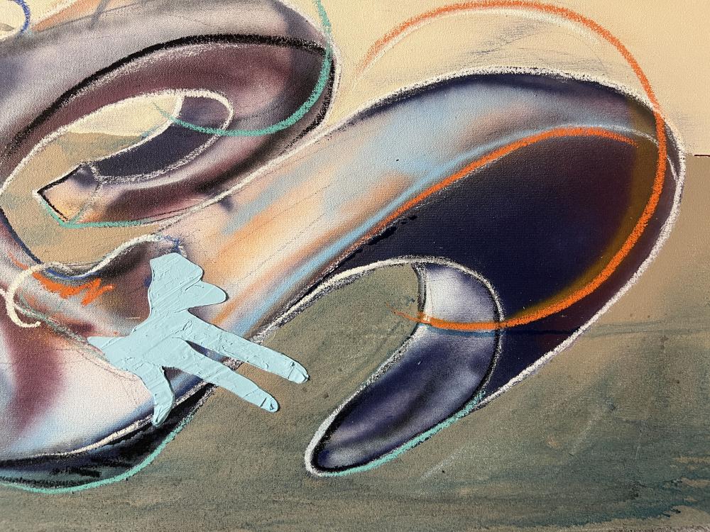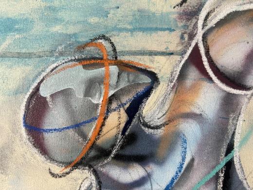 そのあと、アクリル絵の具で細かな補色やラインを足していき、最後にオイルパステルを用いて最初のイメージの軸となる線を浮き立たせていく制作手順で活動しています。