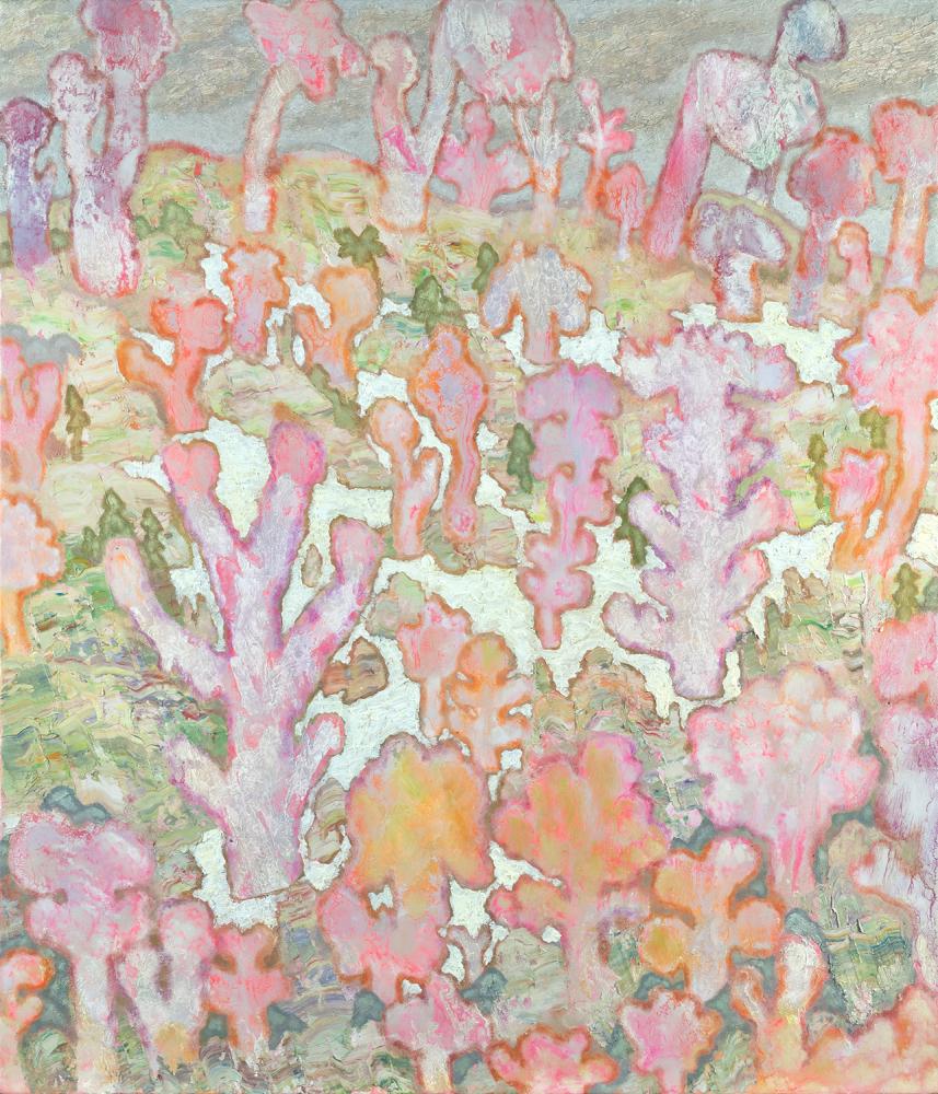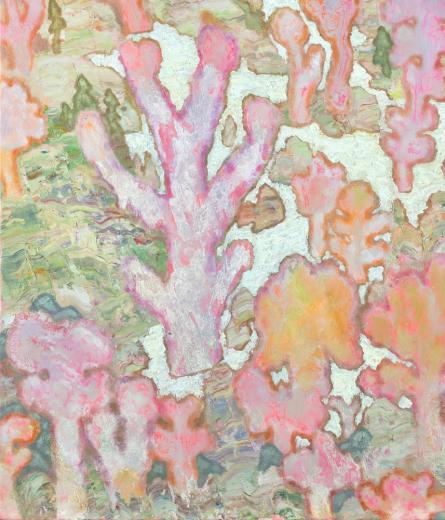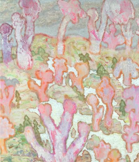 生物の幼生や幼体、植物の新芽や花などを描いている。成体になる前の柔らく曖昧なその段階は「これから」どのような形になるのかを想像させる存在でもある。また、絵を描く過程で発生する油絵具の滲みや掠れが、何かに見えそうと想像することも画面の「これから」を意識する行為である。何になるかわからない存在、あやふやな輪郭、絵具の変化、それらが絵画の中で浮遊し漂いながら、少しずつ形が浮かび上がってくる。そしてそれらが組み合わさり、ここではないどこか遠くの向こう側の景色になったとき、「これから」を想像させる絵画になるのではないかと思っている。
