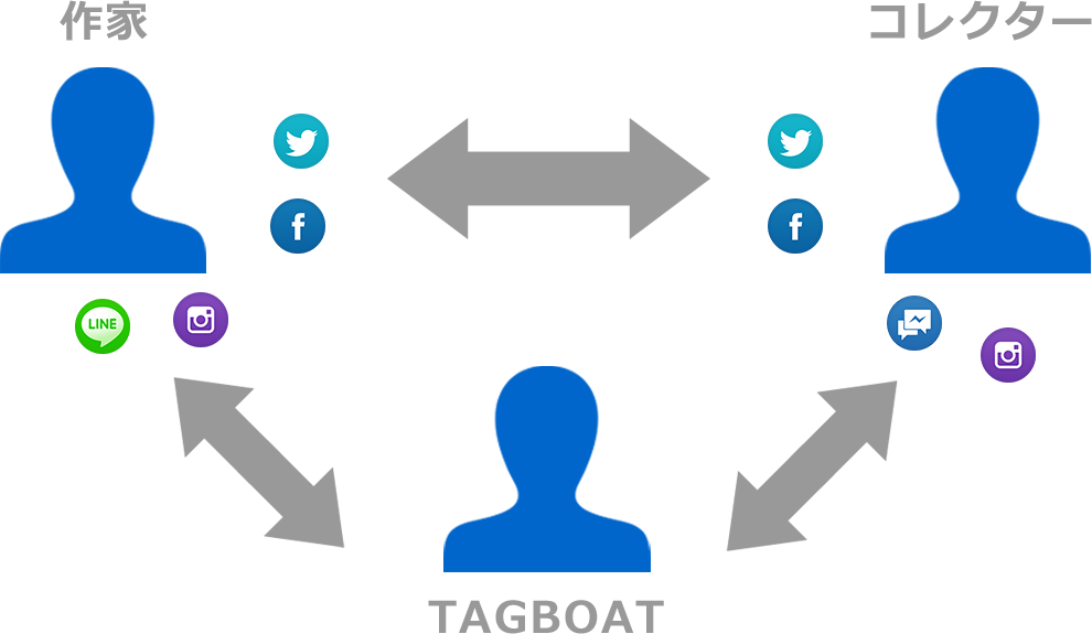 しかしITが進化しSNSが充実した今、誰もが自分自身で発信しプロデュースをしていける時代に変化しました。 タグボートではこのSNSを使った有効なPR方法を作家に伝えるだけなく、作家の代わりに発信もする事で、作家のセルフプロデュースを協働で行います。 個々が持つキャラクターや作品の魅力を、作家自身がまず発信していく事が一番重要ですが、そこにタグボートが持つ集客力・販売力が加わる事で、多くのコレクターを巻き込んでの相乗効果を狙えるからです。